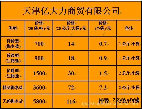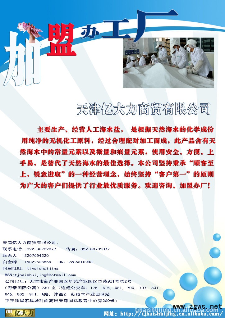 天津亿大力商贸有限公司天津亿大力商贸有限公司主要生产、经营人工海水盐,是根据天然海水的化学成份用纯净的无机化工原料,经过合理配对加工而成,含有天然海水中的常量元素以及微量和痕量元素,使用安全、方便,是替代天然海水的最佳选择。本公司秉承“顾客至上,锐意进取”的经营理念,坚持“客户第一”的原则为广大客户提供优质的服务。欢迎咨询、加盟办厂!