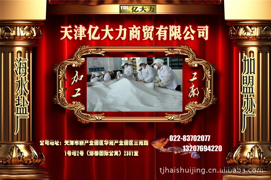 天津亿大力商贸有限公司天津亿大力商贸有限公司主要生产、经营人工海水盐,是根据天然海水的化学成份用纯净的无机化工原料,经过合理配对加工而成,含有天然海水中的常量元素以及微量和痕量元素,使用安全、方便,是替代天然海水的最佳选择。本公司秉承顾客至上,锐意进取的经营理念,坚持客户第一的原则为广大客户提供优质的服务。欢迎咨询、加盟办厂!