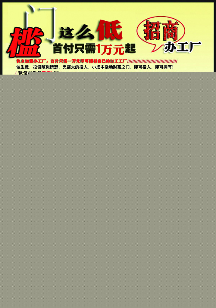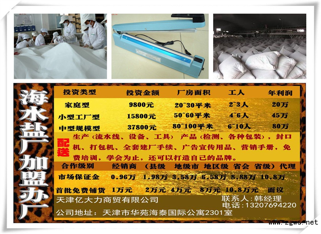 我们是天津最大的海水盐(晶,素,精)加工工厂,招商办厂家庭型,小型工厂,办厂投资9800元,产房20平方米,工人2~3人,生产配送工具,产品各种彩色包装,配送封口机,打包机,全套建厂手续,广告宣传用品,营销手册,免费培训,学会为止,还可以打造自己的品牌。韩经理13207694220招商热线
