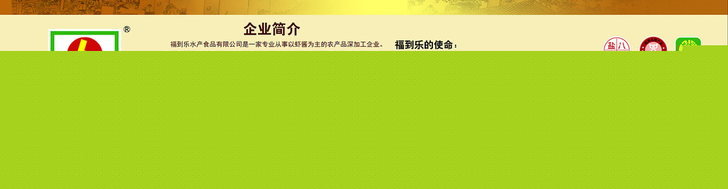 公司成立以来一直秉承“走开发农产品深加工增值之路,为发展农村经济农民致富服务”的生产经营宗旨,近年来由公司自主研发生产了受市场欢迎、为消费者所亲睐的福到乐牌虾仔酱(麻虾酱)、虾黄酱、虾籽酱、虾辣酱、虾酱王、开洋鲜贝、蟹黄油、风味干虾、精制开洋、田螺姑娘(螺狮酱)、鲜鲜鲜(蚬子酱)、黄泥螺、特色鱼干等产品。“福到乐”坚持高起点定位,生产高品质优质安全的农副产品的理念,采用现代科学技术与传统生产工艺相结合的独特的生产技术,不断装备高科技含量的生产设备,引入高科技生产技术,使公司的产品质量不断得到提升。福到乐牌部分特色虾酱系列产品、特色鱼干、蚬子酱、螺狮酱等产品填补了市场空白,实现了经济效益和社会效益双丰收。近年来,产品荣获了“江苏省第九届食品博览会金奖”、“中国消费品市场食品安全放心品牌”、“盐城八珍”、“盐城市名牌”、“盐城市优秀接待用品”、“盐城市优秀旅游商品”、“盐城市消协推荐商品” “中国农产品交易博览会畅销产品”,公司还被评为“江苏省食品生产放心企业”等殊荣。